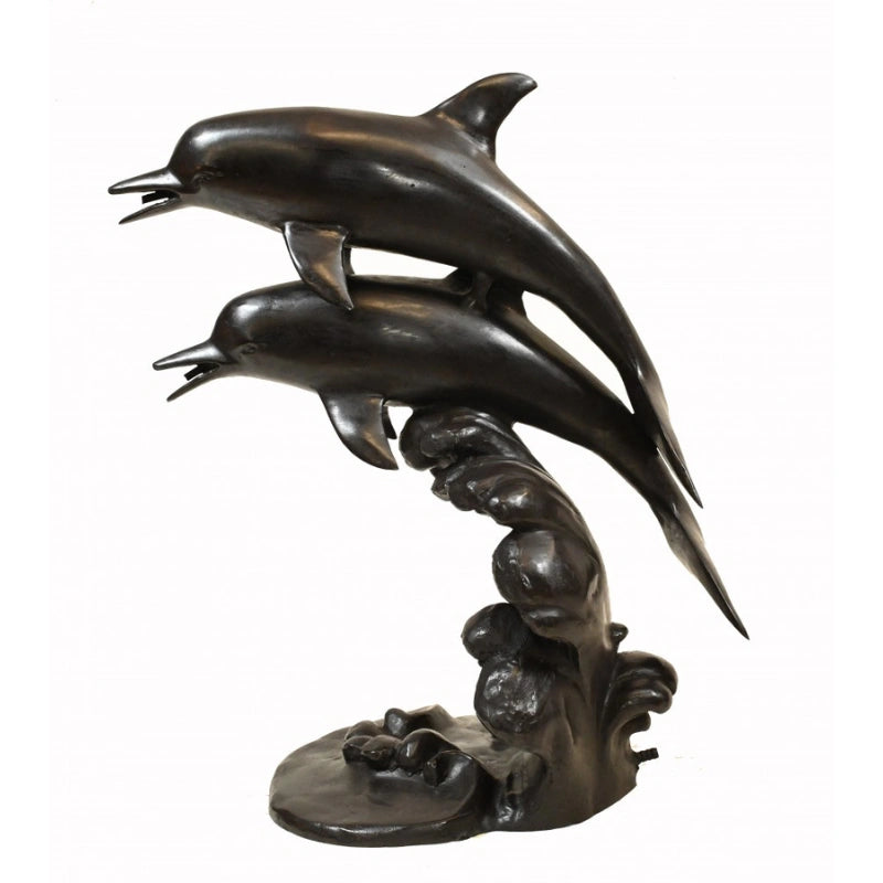Gorgeous bronze casting of a pair of dolphins leaping through the water