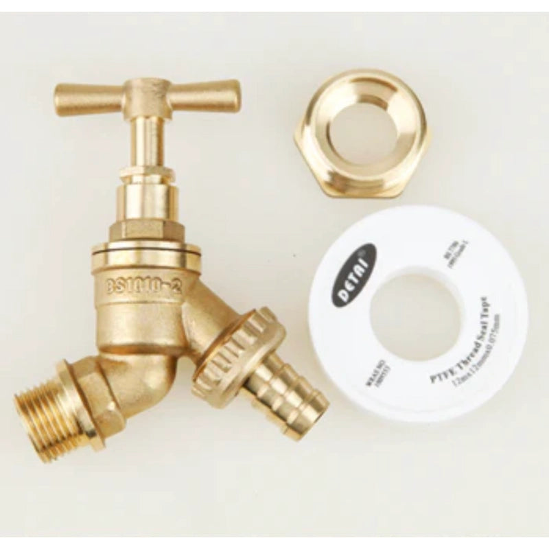 The kit includes essential components for a secure and reliable water outlet connection. It features a high-quality brass tap for durability and corrosion resistance, ensuring long-term performance in outdoor environments. A brass reducing nut is also included to provide a secure fit between different pipe sizes or tank outlets.